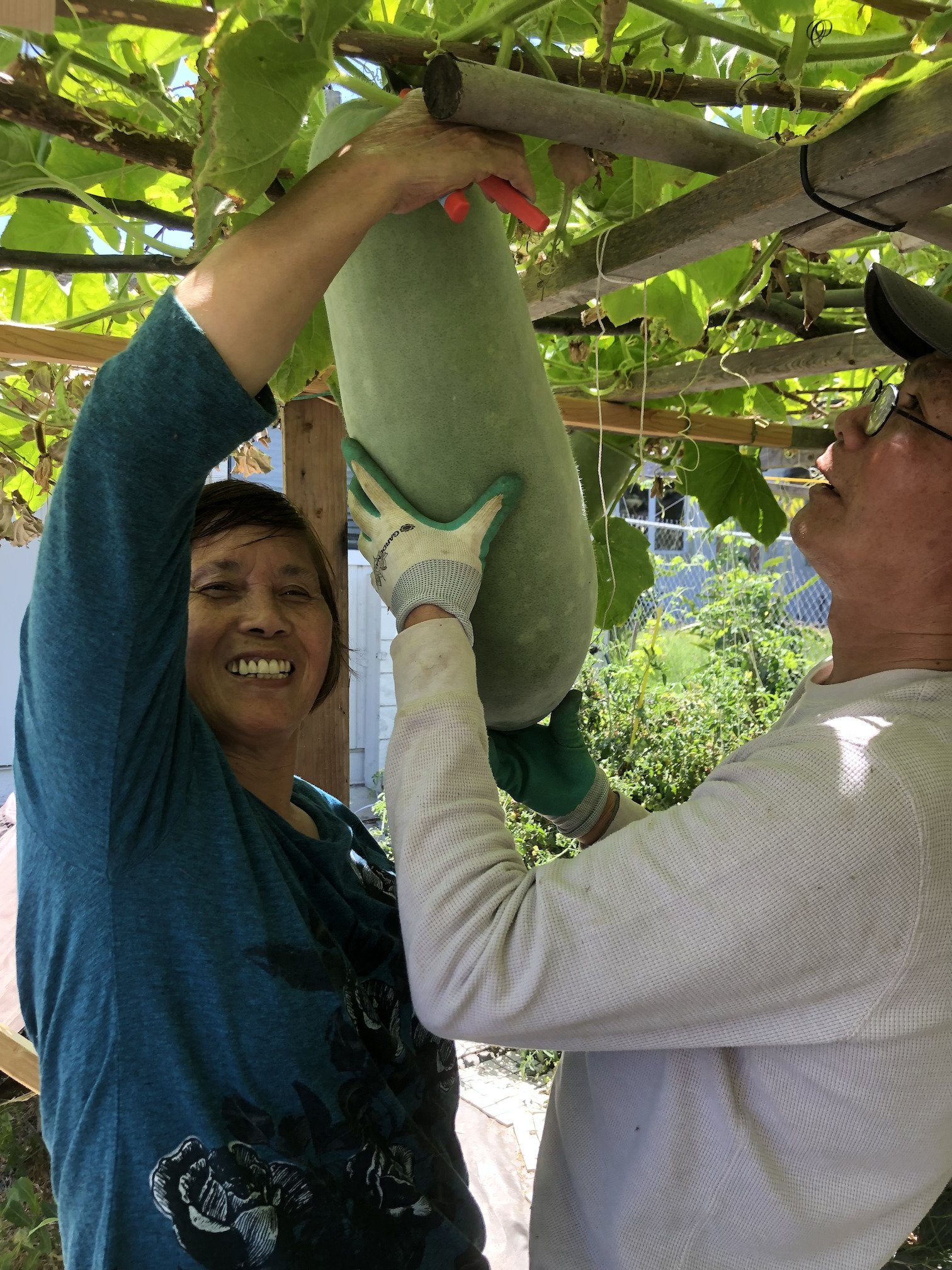 to grow winter melons and once they grow big, she uses tiny hammocks to support them in the